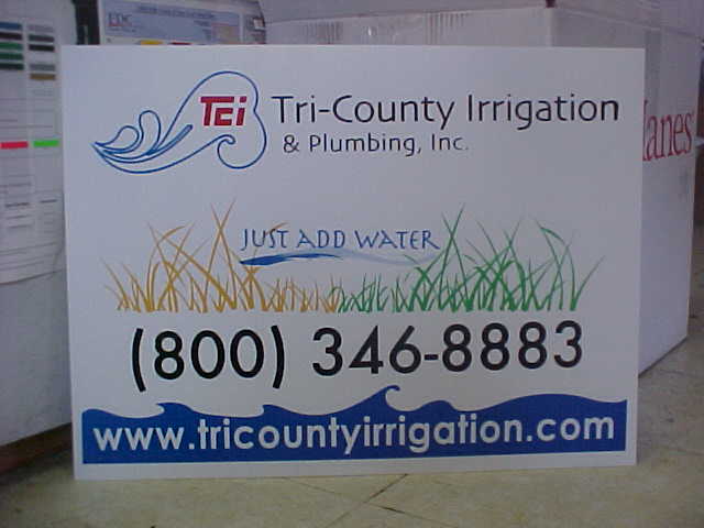 Tri-County Irrigation & Plumbing, Inc. Screen printed coroplast with 5 color print and 3-D look with half-tone dots